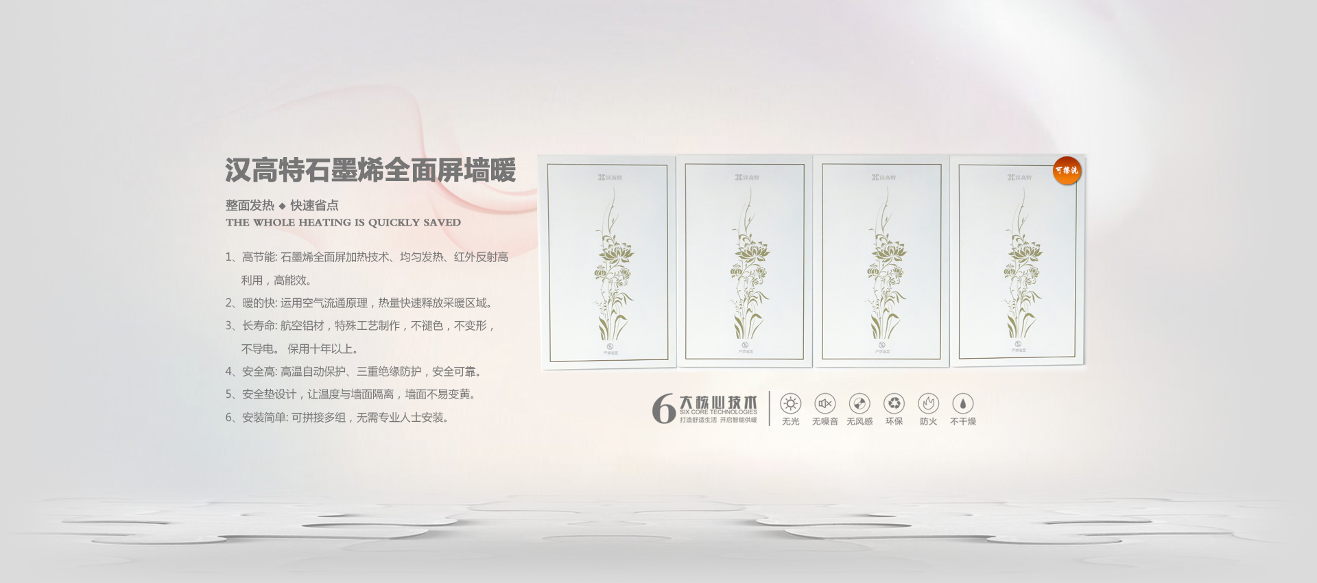 漢高特自主研發(fā)的新型石墨烯電地暖、石墨烯電采暖、電熱膜電地暖、碳纖維電暖、碳晶墻暖畫、電地暖廠家加盟、電熱膜工廠,采用新設計、新材料在行業(yè)內(nèi)首創(chuàng)了耐強酸、耐強堿、防火阻燃、防水防潮等特點。產(chǎn)品暢銷江蘇、四川、甘肅、山西、河北、河南、內(nèi)蒙、新疆等地。